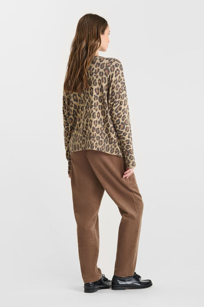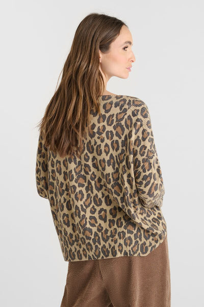 Jersey de punto fino con estampado de leopardo y cuello barco, una prenda versátil que combina comodidad y tendencia.