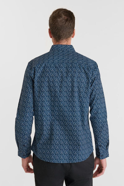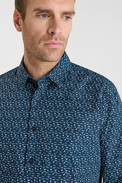 La camisa Vostar azul combina el estilo clásico con un punto distintivo gracias a su estampado de pájaros. Confeccionada en algodón 100% suave y transpirable, ofrece una sensación agradable sobre la piel, perfecta para el día a día o para elevar un look más informal. Su corte recto garantiza comodidad y una caída natural que favorece a todo tipo de siluetas.