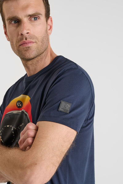 T-shirt azul de algodón con estampado fantasía, ideal para un look moderno y versátil.