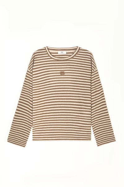 Camiseta de manga larga en tonos marrones con rayas y parche de monograma, perfecta para un look casual con estilo. Su tejido suave y elástico ofrece confort y un ajuste favorecedor.