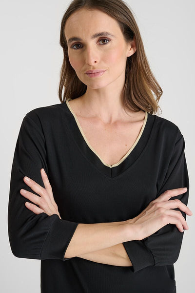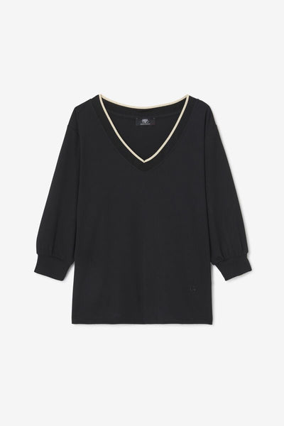 Camiseta con escote en pico y ribetes en contraste, diseñada para aportar un toque moderno a un básico atemporal. Su tejido suave y su corte recto garantizan comodidad durante todo el día.
