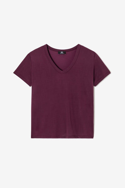 Camiseta burdeos de manga corta con escote en pico, ideal para aportar un toque elegante y femenino a tus looks del día a día.