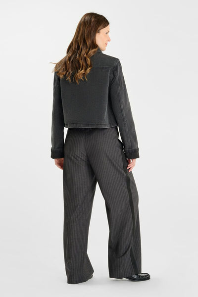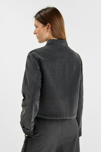 Chaqueta vaquera gris de corte recto, cierre a presión y bordado de logo que añade un detalle distintivo.