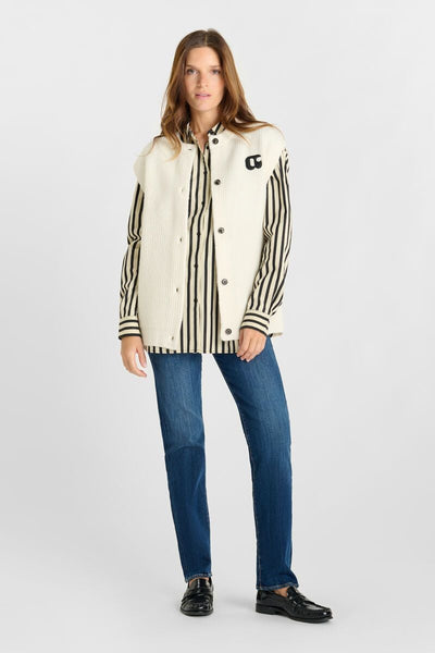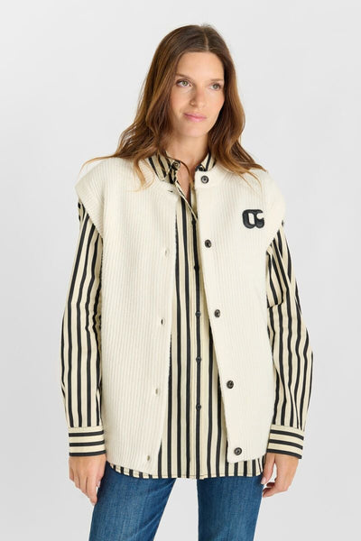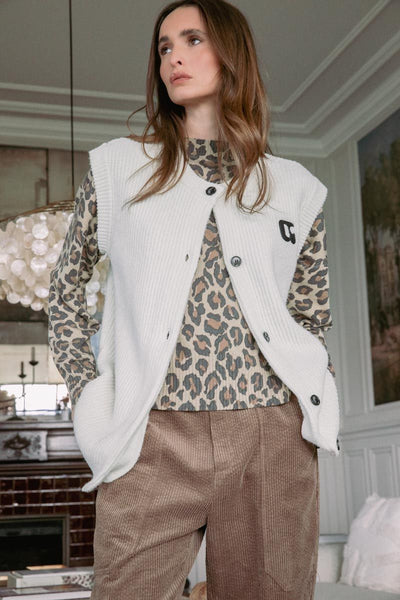 Chaleco largo color crema, abotonado y con parche logo, diseñado para aportar un toque sofisticado y versátil a tu outfit. Ideal para combinar sobre camisetas, blusas o vestidos.