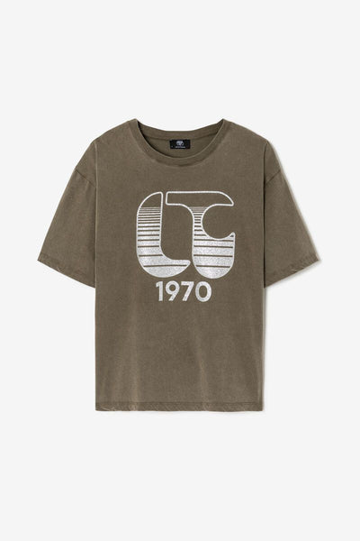 Camiseta de algodón color caqui con monograma brillante, ideal para quienes buscan un toque luminoso en un look casual.