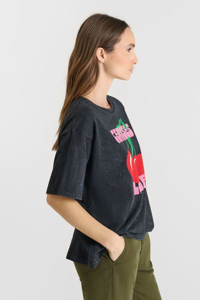 Camiseta negra de algodón con estampado fantasía, perfecta para dar personalidad a tus looks más casuales.