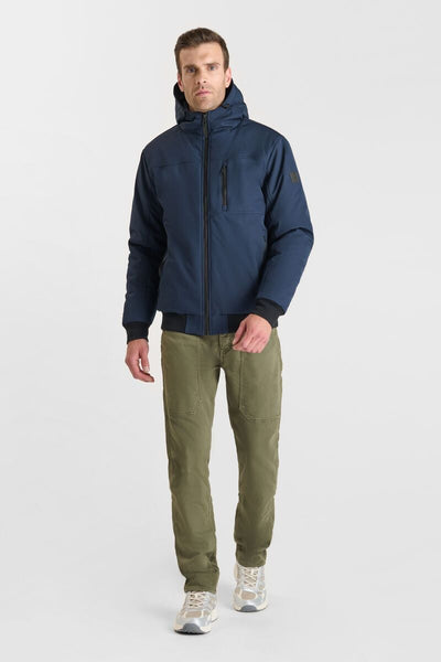 La parka Boma azul marino combina diseño moderno y confort para acompañarte en los días más frescos. Su interior acolchado y su tejido técnico con elasticidad garantizan abrigo y libertad de movimiento, mientras que su capucha integrada añade un toque práctico y urbano.